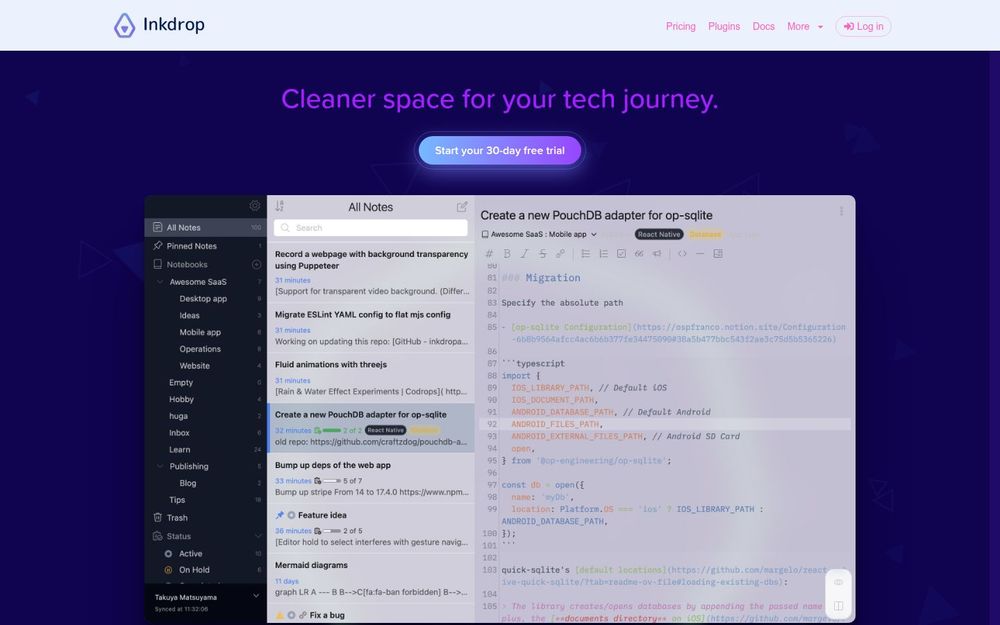 - Rich Plugin Ecosystem: With over 100 plugins available, Inkdrop can be extended to meet the specific needs of users, whether it's for task management or enhanced Markdown support.